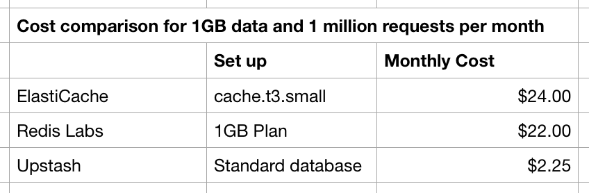 • Serverless Pricing: Elasticache does not have a serverless pricing model. The price does not scale to zero. You need to pay for the instances even when you do not use them. Upstash charges per request.